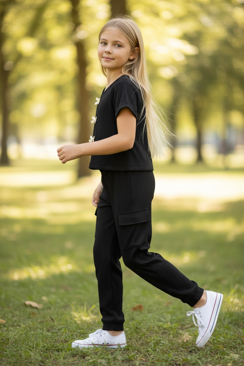 Girl's Two-Piece Crinkle Plisse Pant Set with Bow Details Get ready to turn heads with this fun two-piece pant set designed for tweens who love a little extra flair. The crinkle plisse fabric creates an eye-catching textured look that's way more interesting than basic basics, while the adorable bow accents bring personality and charm. It's the kind of outfit that works for everything from weekend hangouts to special occasions. Comfortable, stylish, and totally Instagram-worthy.